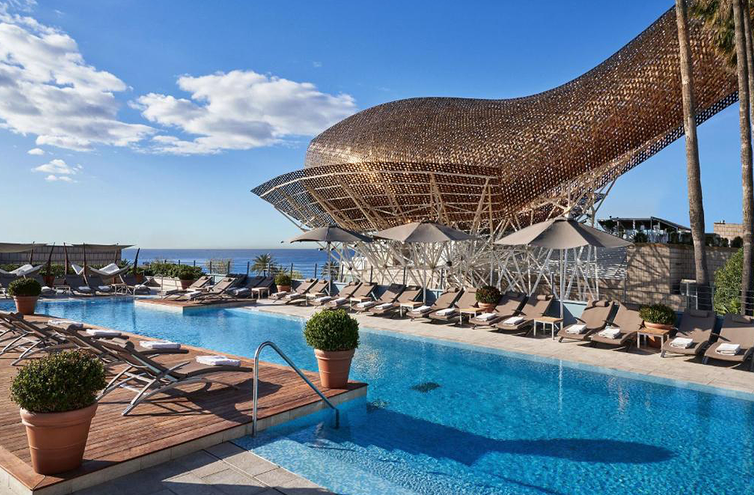 Unwind amidst expansive gardens, a family pool, an infinity pool or 43 The Spa, floating high above Barcelona on the 43rd floor. Hotel Arts Barcelona also champions world-class cuisine across its five restaurants and signature cocktail bar. Whether indulging in Gaudí's Parc Guell and La Sagrada Familia or savouring tapas and rooftop cocktails, this Barcelona resort blends fine dining, upscale shopping, and seaside serenity.