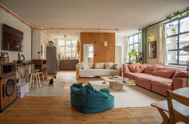 Set inside a converted Victorian warehouse between London Fields and Victoria Park, this airy Hackney flat nails that effortless East London cool. Exposed brick walls, vintage furniture, a stacked book shelf and floor-to-ceiling windows give it serious loft energy, while the neighbourhood delivers everything from indie cinemas and theatres to creative markets and cosy pubs within walking distance.