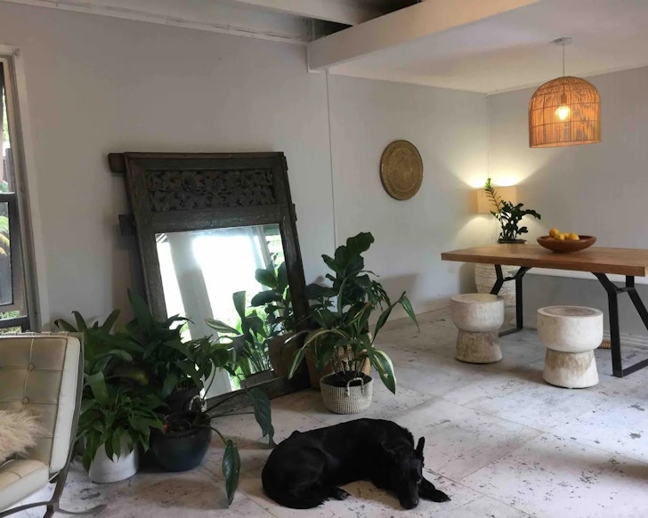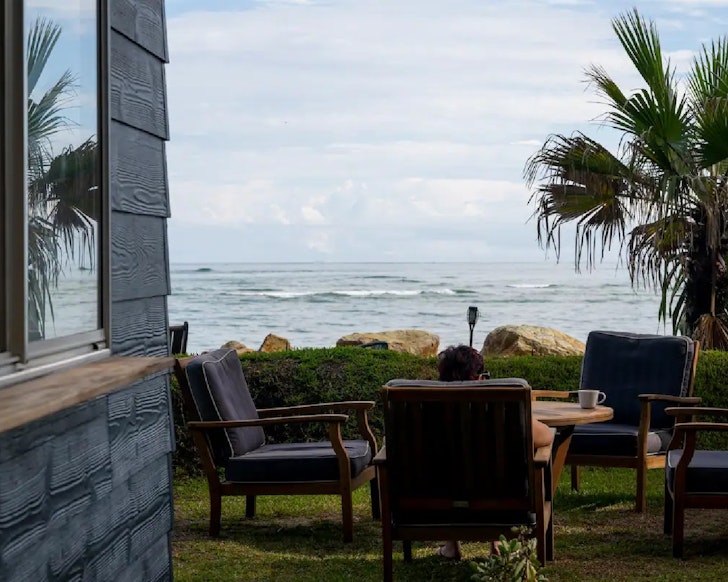 Now this one is giving all the boho beach vibes. “Pied-a-Mer” offers stunning views of Home Beach and a relaxing indoor-outdoor experience perfect for couples and families. Decked out with greenery, pottery, and low-lighting, a large master bedroom leads out to a small verandah, and a Balinese-style bathroom with louvers opens into the bushland.
