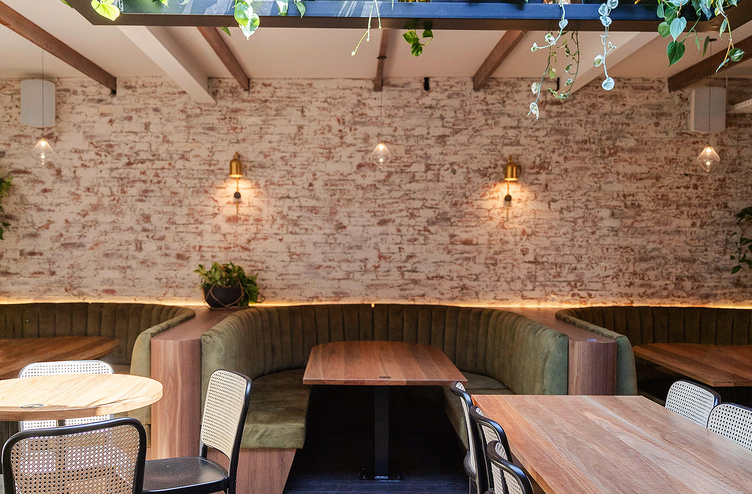 The sprawling 250-seater venue houses four distinct spaces, which seamlessly shift between post-surf bevvies and late-night cocktail vibes. Venture past the front terrace, which features high bench tables, prime for sinking a few cold ones and chatting with passerbys. Once you’re inside, the first thing you notice is the large skylight filtering dappled sunlight through into the stylish interior, which merges a contemporary restaurant with a laidback pub atmosphere. Washed brick walls contrast with timber-hued furnishings, pops of greenery cascade from above and olive-green velvet booths line the wall, temptingly inviting you to sink in.