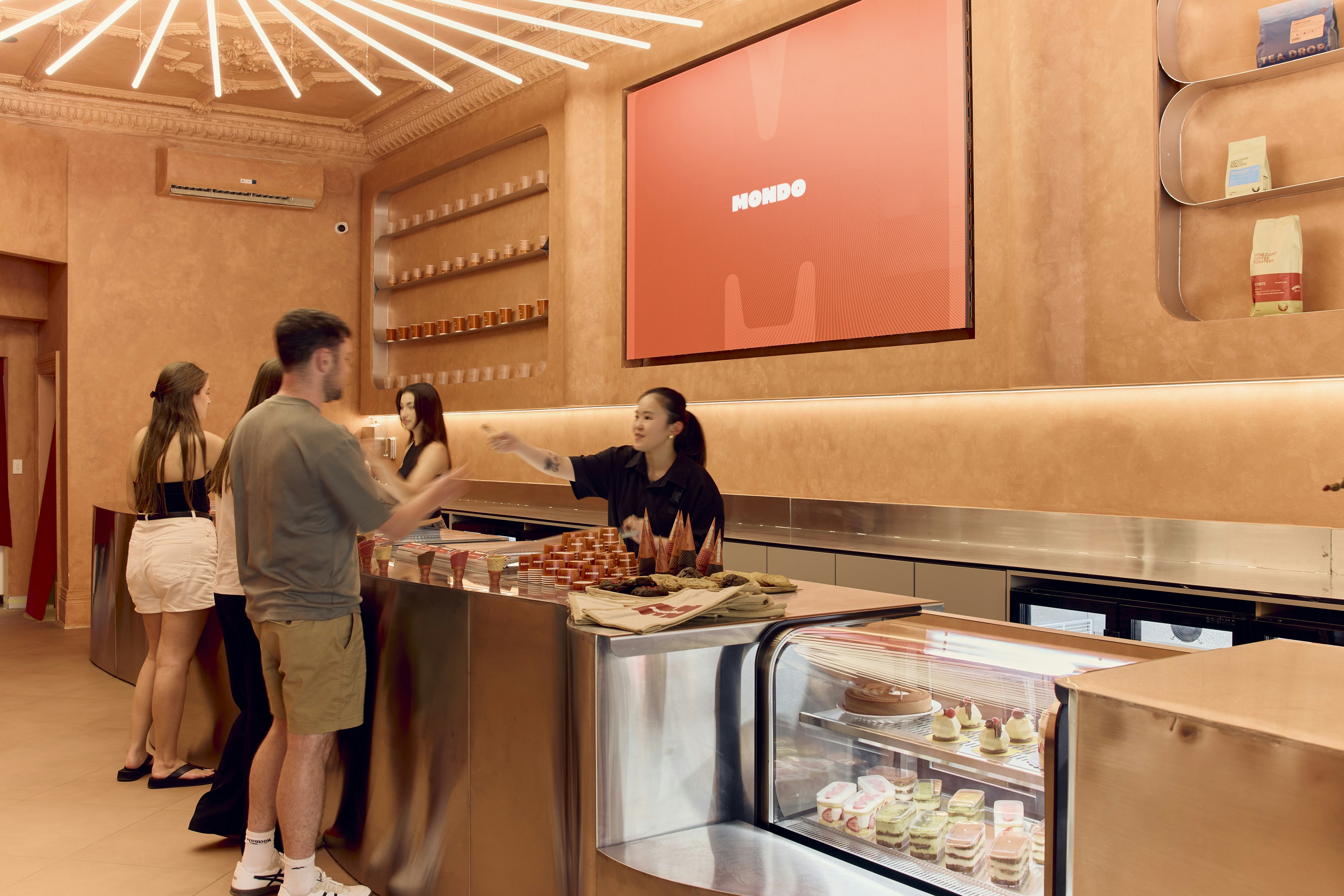 Set inside a 150-year-old heritage building on Elizabeth Street, Mondo masters that nostalgic-meets-modern balance. Designed by Aydnco Commercial Interiors, the fit-out pairs intricate cornices and dusty peach walls with a sculptural ceiling light in the shape of Mondo’s radiant sun emblem—each ray inscribed with global coordinates, a nod to their mantra of culture and community.