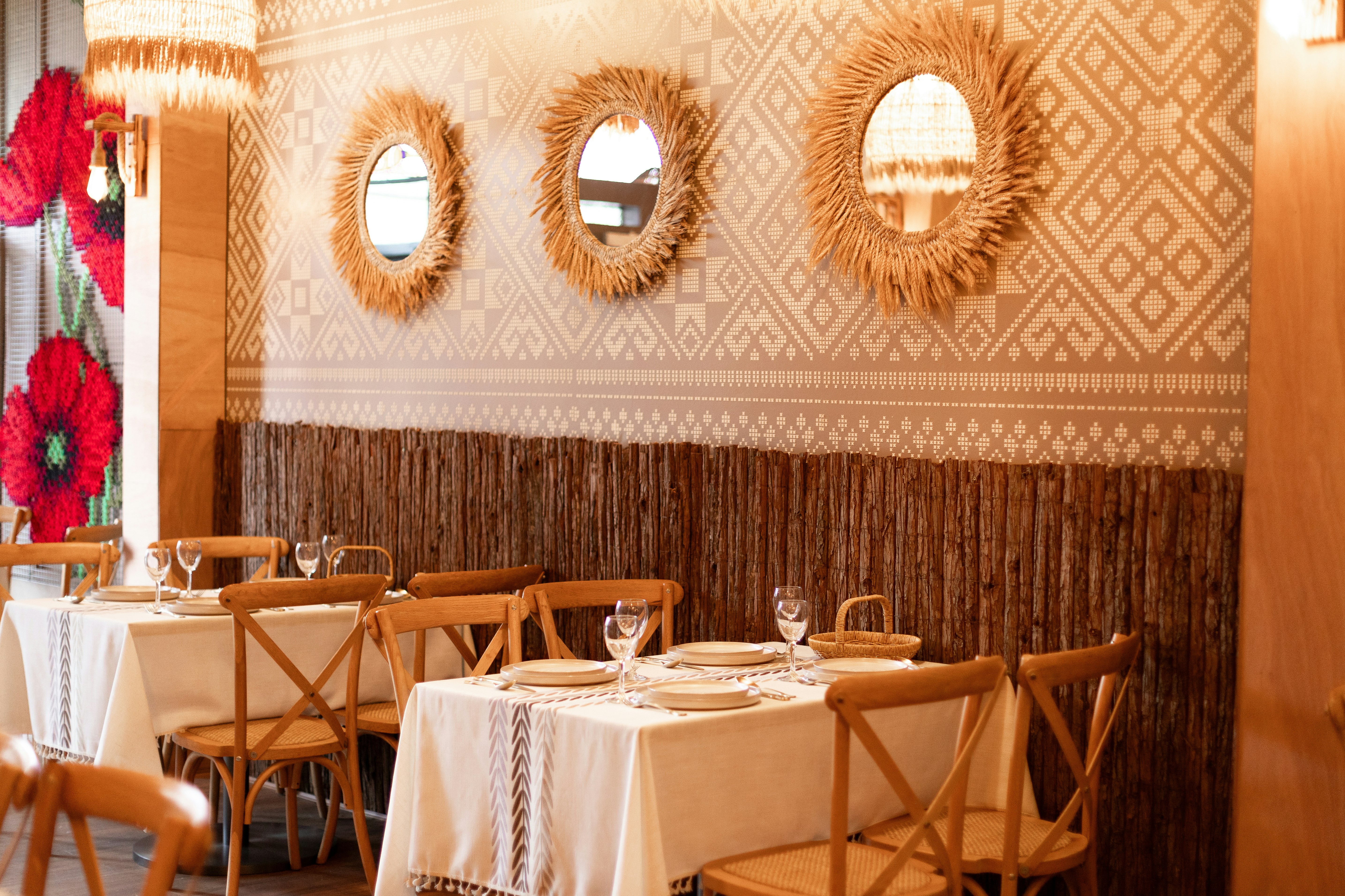Otakoï is deeply Ukrainian. Not just in style—the wheatsheaf decorations and traditional dress—but in substance. Everything that could be sourced from home or made by refugees has a Ukrainian hand in it, from art and embroidery to a cabinet of folk crafts and jewellery for sale and snacking sunflower seeds on every table.