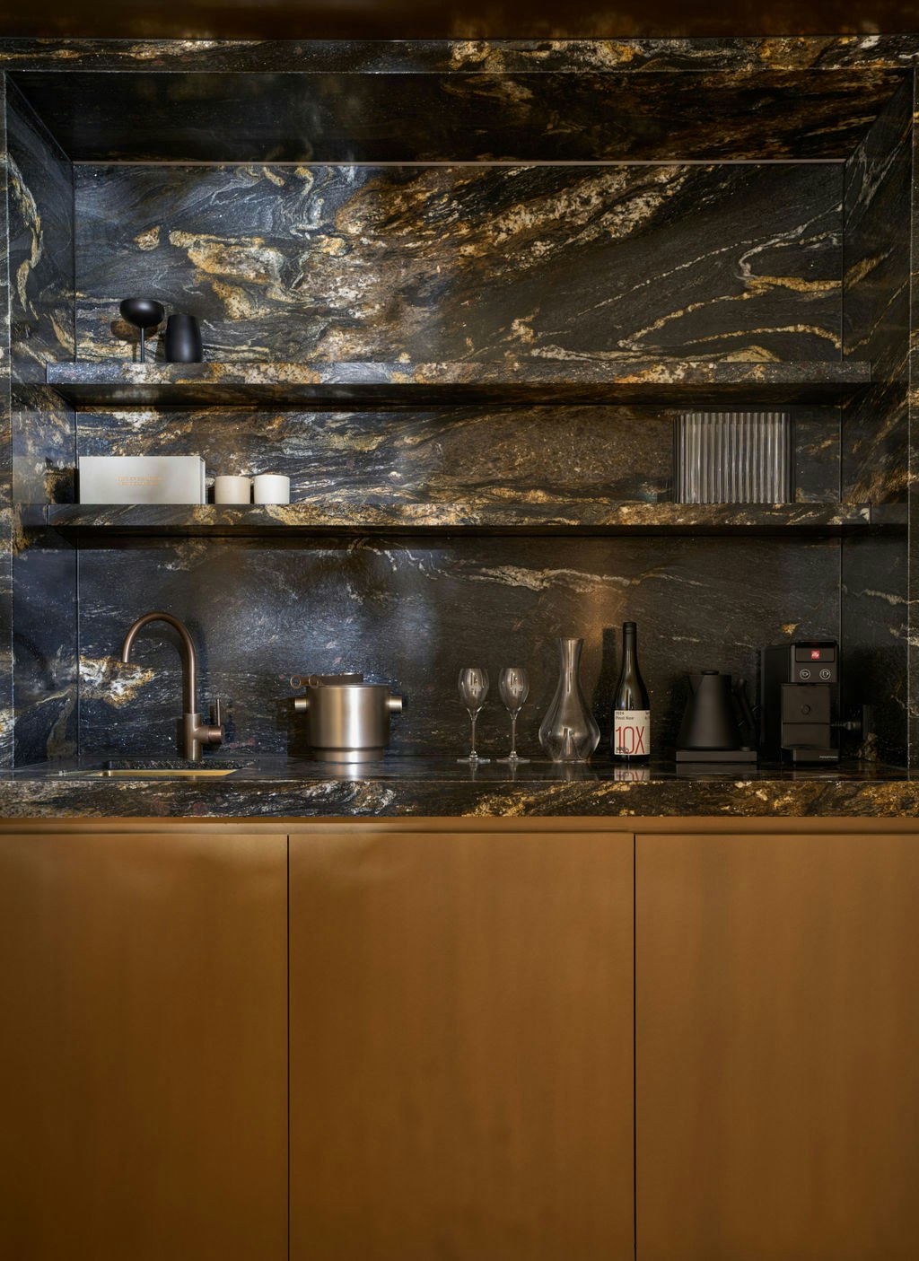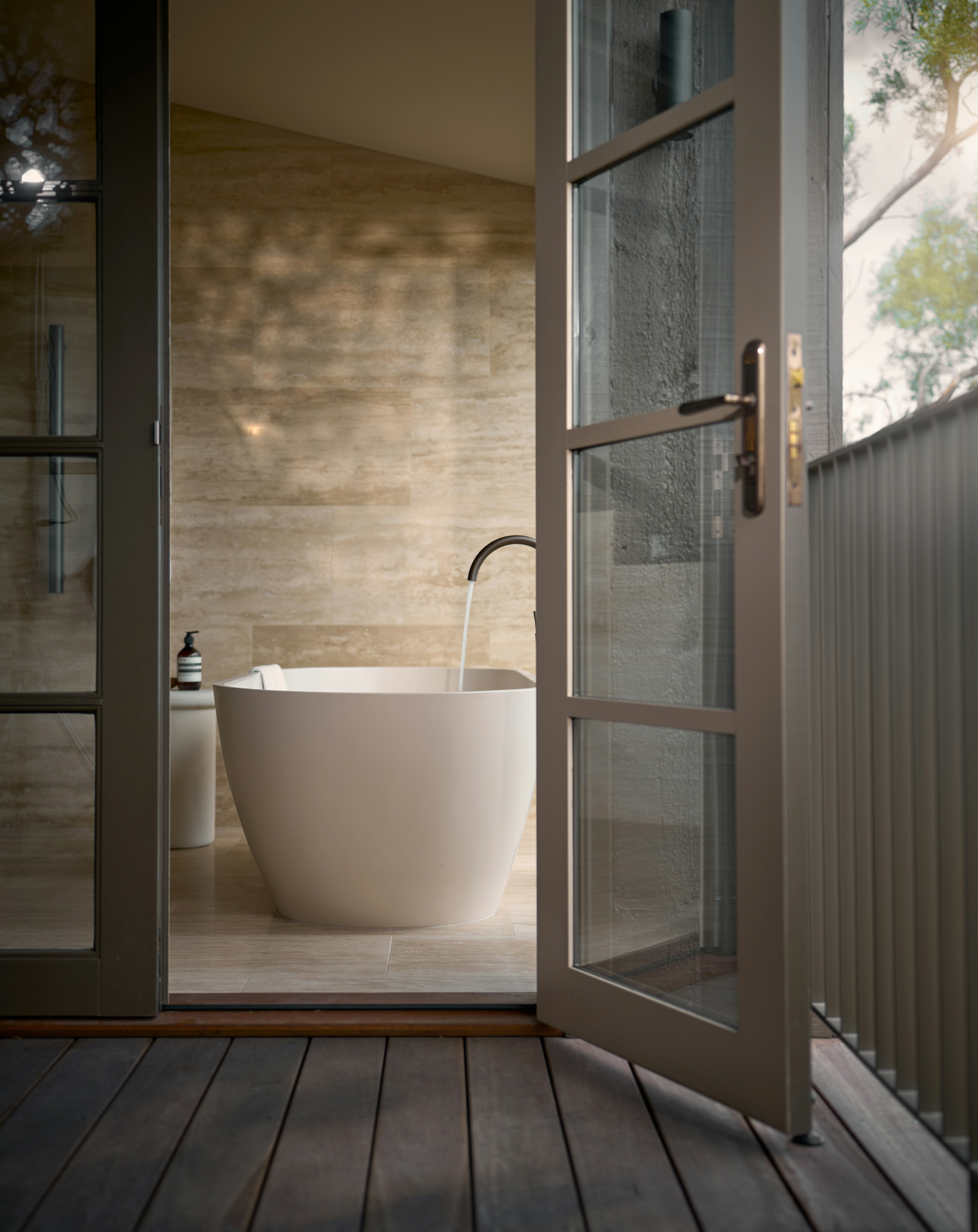 The minimalist interiors with clean lines, natural wheat tones, bespeckled tiling and a perfect blend of Italian, Palm Springs and modern Australian design sing a chorus amid the bushy landscape of the Mornington Peninsula.