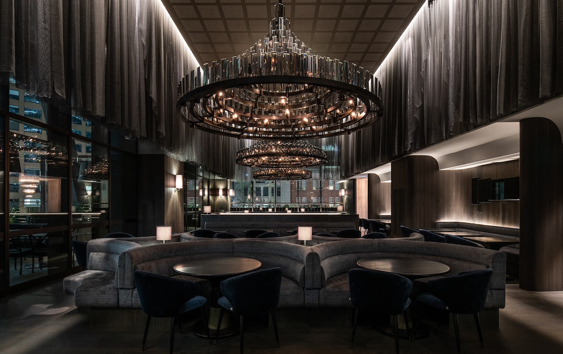 a dark and moody restaurant with a large chandelier