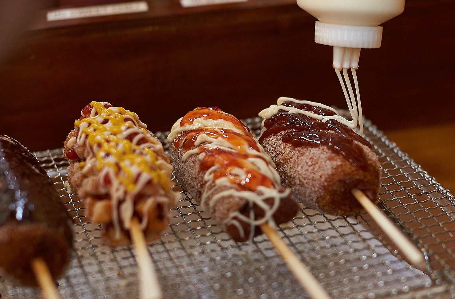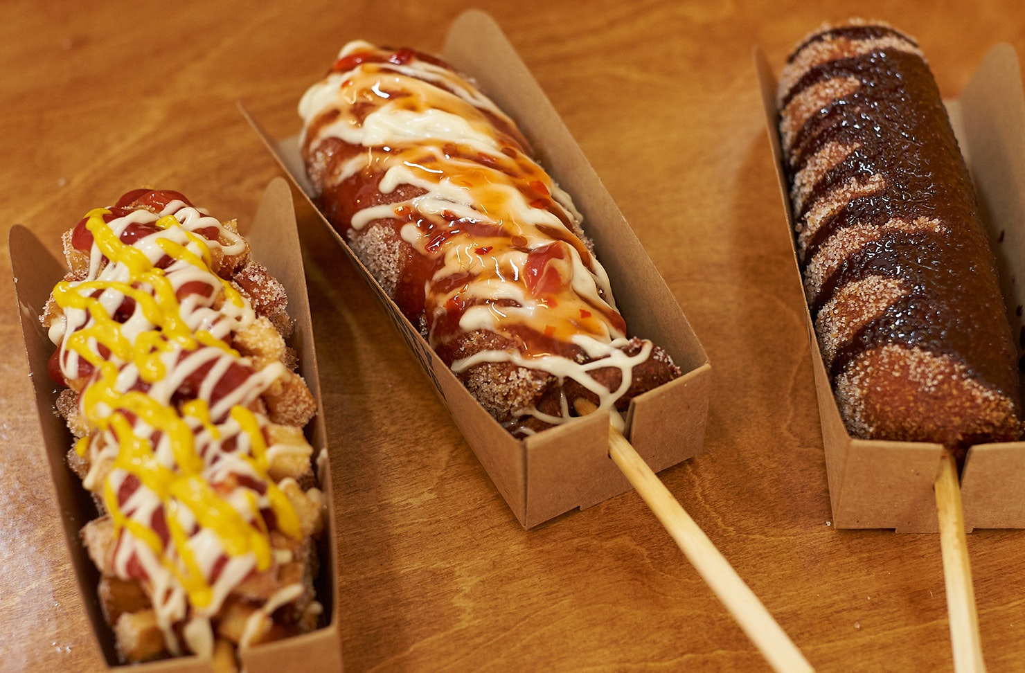 Now, we’re not talking about your average sausage sizzle here, no siree! We’re talking about hot dogs on a stick rolled in dough, fried to perfection, sprinkled with your fave toppings, rolled in sugar and served with lashings of sauce. Get in our bellies.