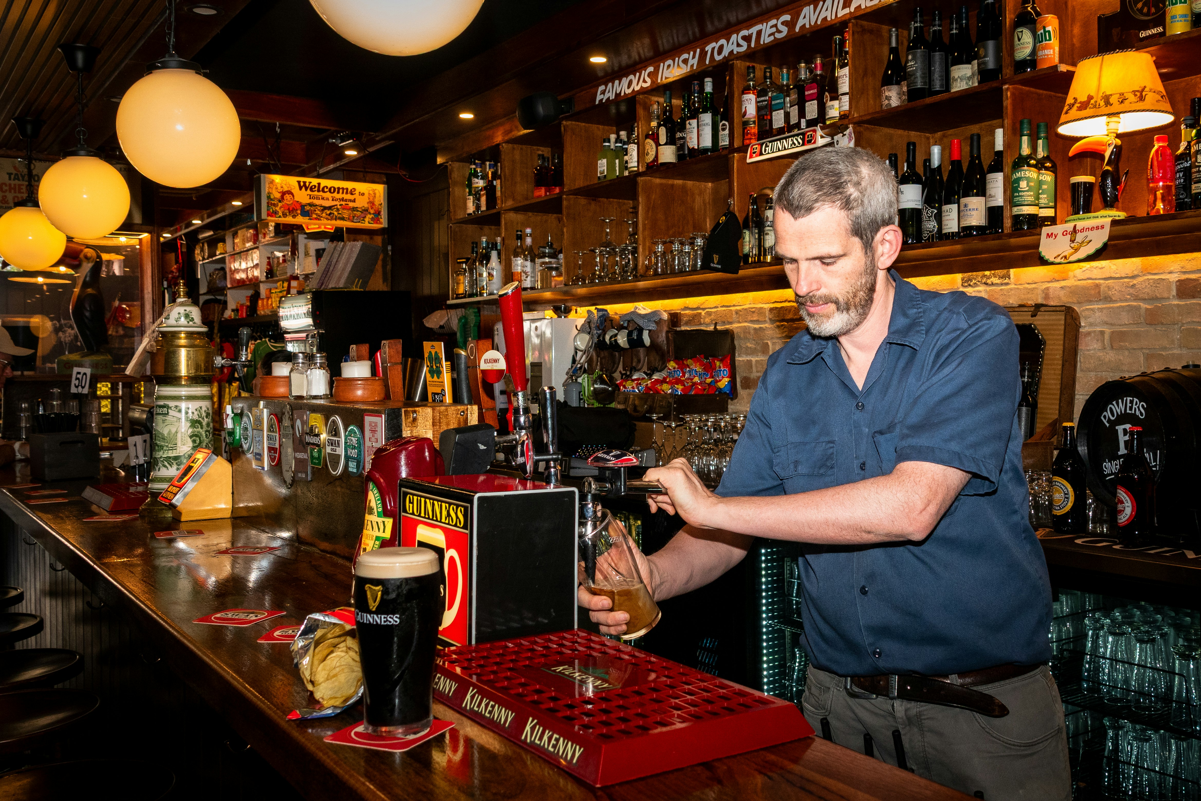Opened in August 2025 by husband-and-wife duo Simon and Jo Carthy, Mons O’Shea isn’t themed, manufactured, or modelled after stereotypes, it’s the real deal. Warm, yellow lights hang over the timber bar, lined with bar stools, brass hooks and scattered coasters. Behind the bar, the shelves are filled with whiskeys, wines, and countless knick knacks. The kind of place built on salvaged antiques, Irish humour, organised chaos, and three generations’ worth of pub-keeping experience.