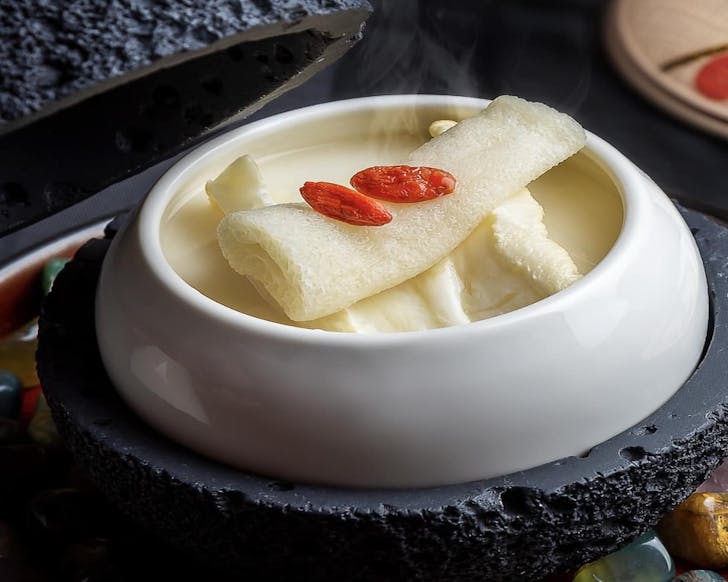 Dim sum fans won’t be left out either, lunch brings artisanal creations like the Radish Puff with Chinese Ham, shaped like a chic handbag, or the vivid Steamed Crispy Red Rice Roll with Shrimp and Pork. For something indulgent, try the Simmered Homemade Beancurd Skin with Baby Spinach in fish broth made from Heilongjiang soybeans, or the tableside-poached Hokkaido Geoduck in a rich, umami seafood broth. Sweet endings come in the form of Baked Taro Tart with Bird’s Nest, layered with ginkgo nut for extra richness.