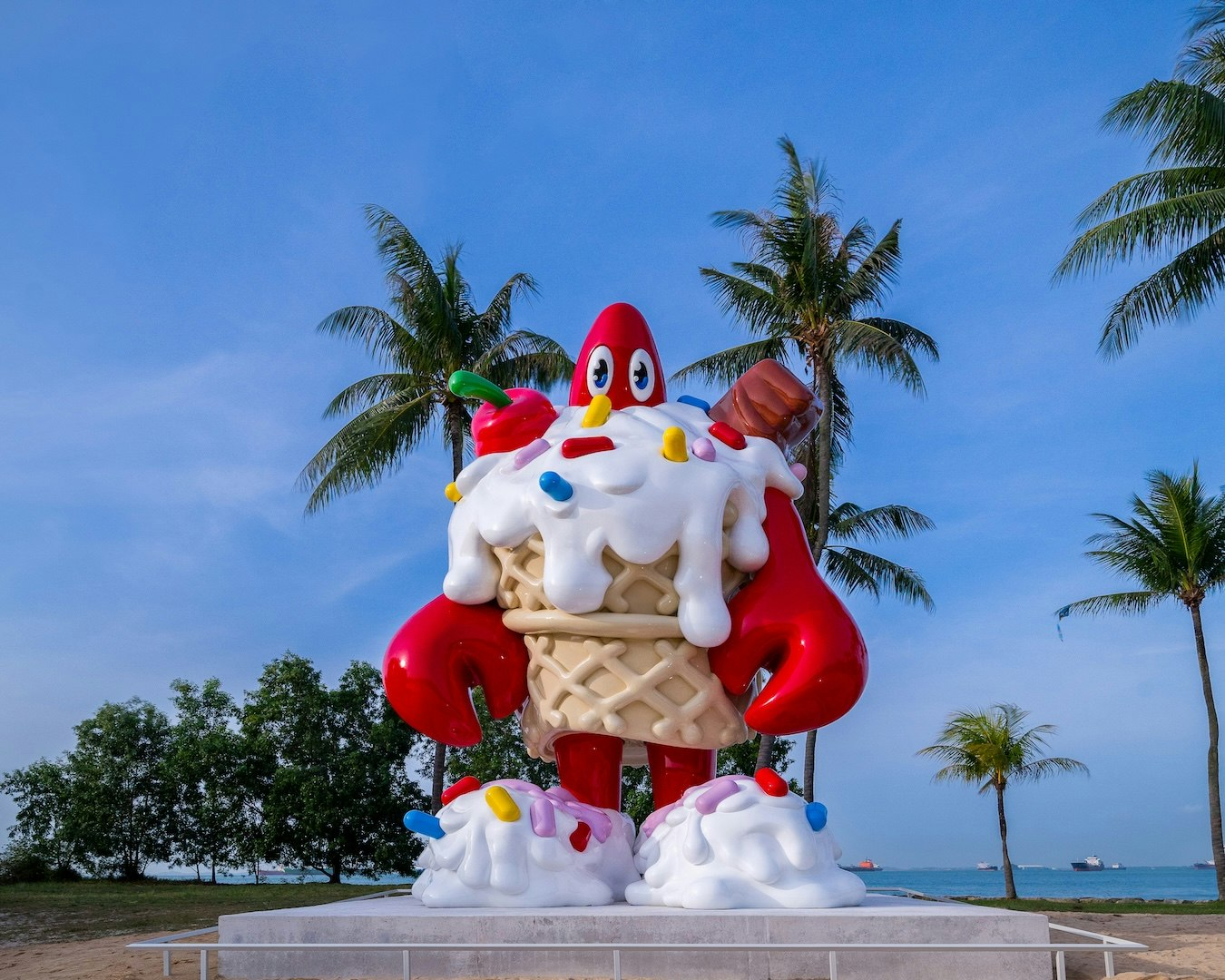 The main event is Lobster Ice Cream, an eight-metre-tall steel sculpture towering over the beach like a surreal seaside mascot. It’s semi-permanent, meaning this gloriously unhinged lobster is sticking around for years, effectively earning itself landmark status. Scattered nearby are massive inflatable works like the Lobster Shark, Lobster Octopus and Lobster Fish, which mash up marine life with Colbert’s cartoon universe, giving the whole beach a soft-sculpture-meets-theme-park energy that’s hard to ignore.
