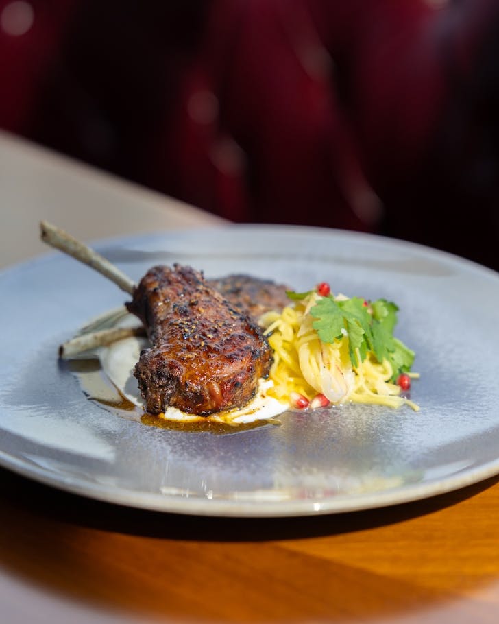 Expect an intimate tasting journey that plays on memory and place. The menu opens with the Chettinad Crab Roti ($21++), golden naan folded around sweet crab and crispy onion, paired with a semi-dry 2021 Château Belá Riesling that tempers heat with citrusy lift. The Prawn Sothi ($38++) follows. It's a silky coconut curry brightened by pomelo and pomegranate, the richness cut beautifully by a crisp Japanese Pinot Blanc. For mains, the Pomfret Pollichattu ($42) arrives parcelled in banana leaf, spiced with black mustard and chilli, best enjoyed with a supple South African Cinsault. Then there’s the show-stopping Lamb Rack ($88), grilled till tender and matched with a powerful 2017 Celler Mas Doix from Spain’s Priorat, its deep structure echoing the meat’s intensity.