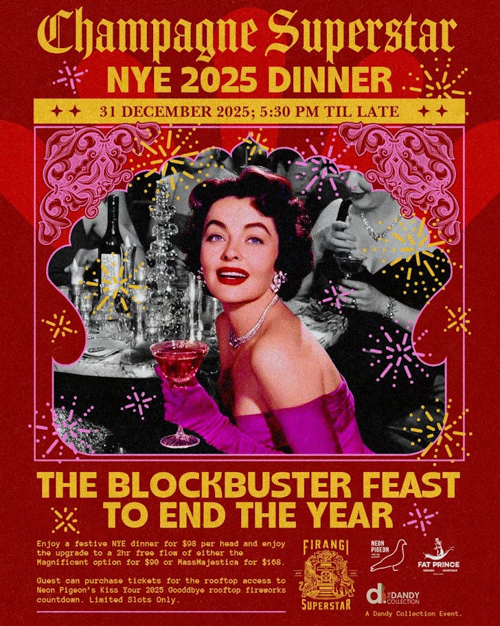 Over at Fat Prince, The Last Supper Club (NYE Edition) leans into soulful Middle Eastern sharing plates for $88 per person, designed for long conversations and a slow-build into midnight. Add two hours of drinks (Prosecco, wines, Asahi draft) for $68, then glide over to the rooftop after 9pm if you want to extend the night.