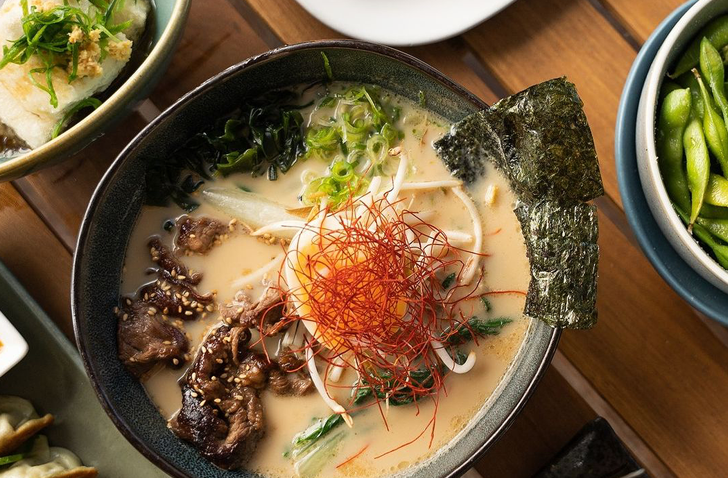 Choose from the shouyu ramen with pork chasu, the miso tonkatsu ramen with pork chasu, the shouyu ramen with wagyu gyoza or the vegetarian-friendly soy sauce ramen.