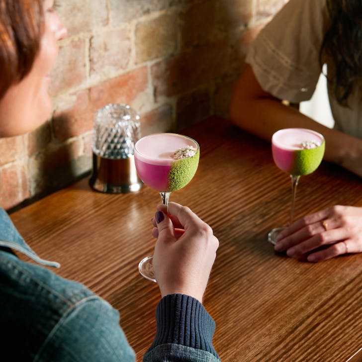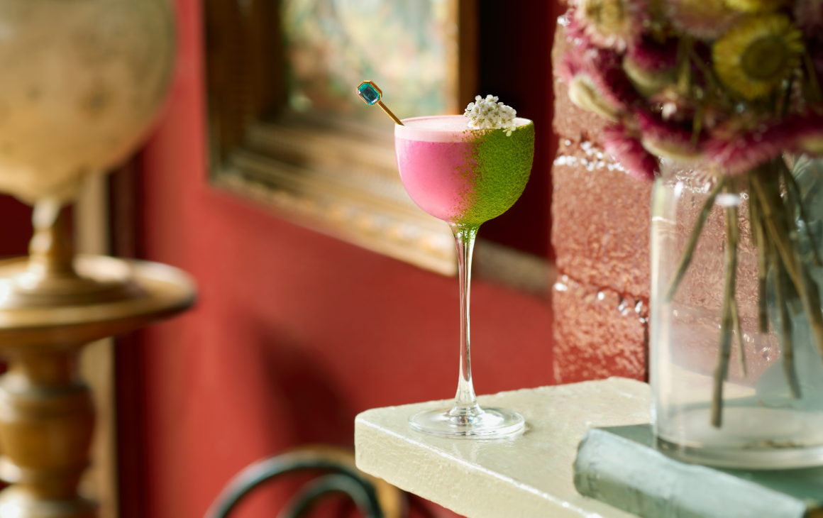 The echoing floral masterpiece is spiked with OG Bombay Sapphire Gin, green jasmine, strawberry gum, dragon fruit and pistachio orgeat, and simply finished with a dusting of matcha down the side of the glass.