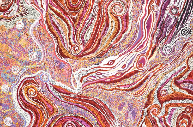 The show includes works from the Warlpiri community in Lajamanu, Northern Territory, far north Queensland, Utopia in the Eastern Desert, the Anangu Pitjantjatjara Yankunytjatjara Lands in South Australia, and the Kimberley in Western Australia. 2021 also marks the 40th year that Cooee Art has been working directly with Australian Indigenous artists and bringing their works to the public.